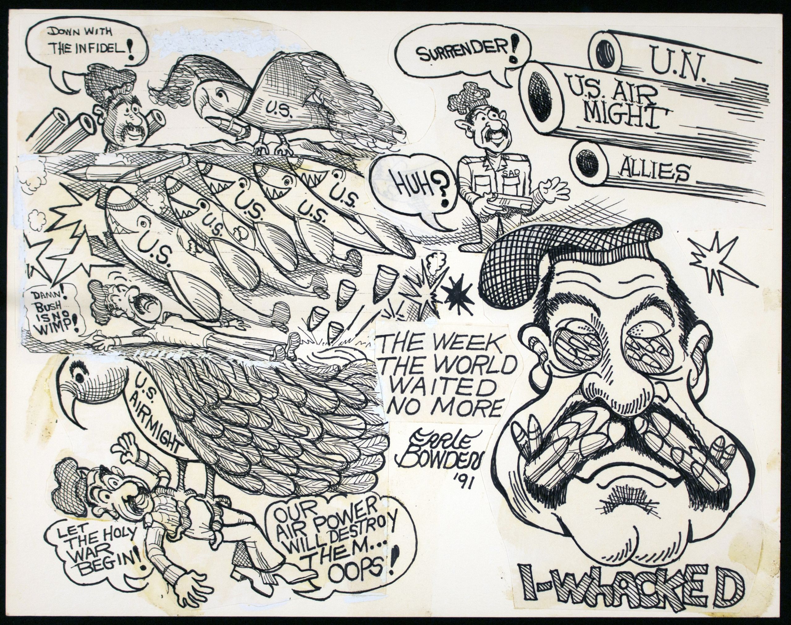| Description/Context: | Stand-alone editorial cartoon, an assemblage of mini-cartoons about Saddam Hussein, and the ensuing battles in Iraq and Kuwait, with subtitle ‘The Week The World Waited No More.” |