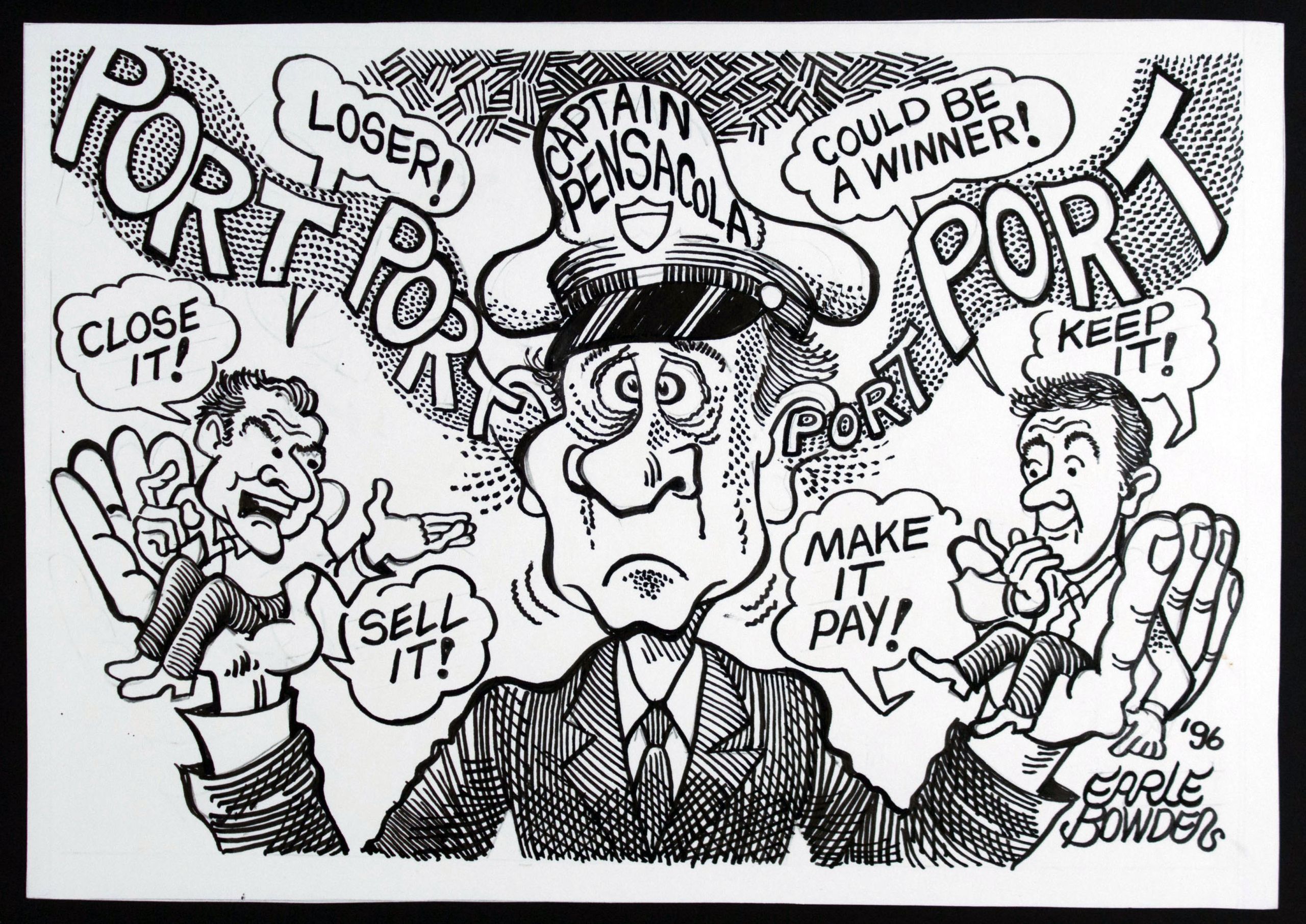 Description/Context: A stand-alone editorial cartoon featuring Captain Pensacola assaulted by two points of view on the Port of Pensacola—close and sell it, and keep it and enhance its revenue.