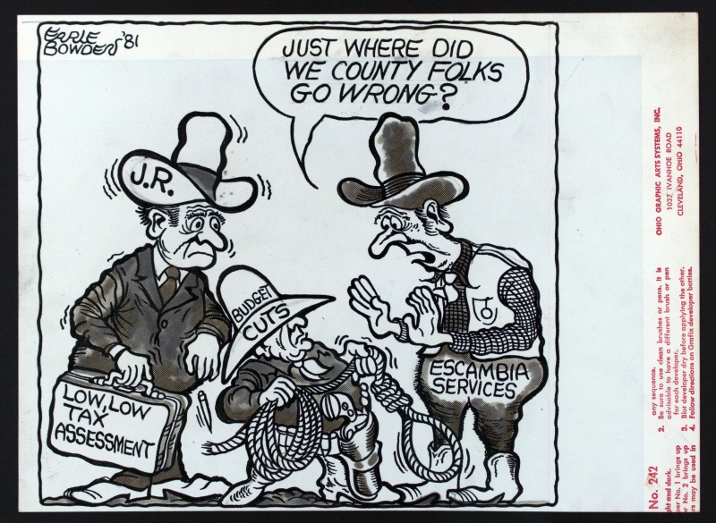 | Description/Context: | A stand-alone editorial cartoon noting shock over reductions to Escambia County services due to budget cuts as well as the lower tax assessments by John R. Jones, Escambia County Tax Appraiser. |