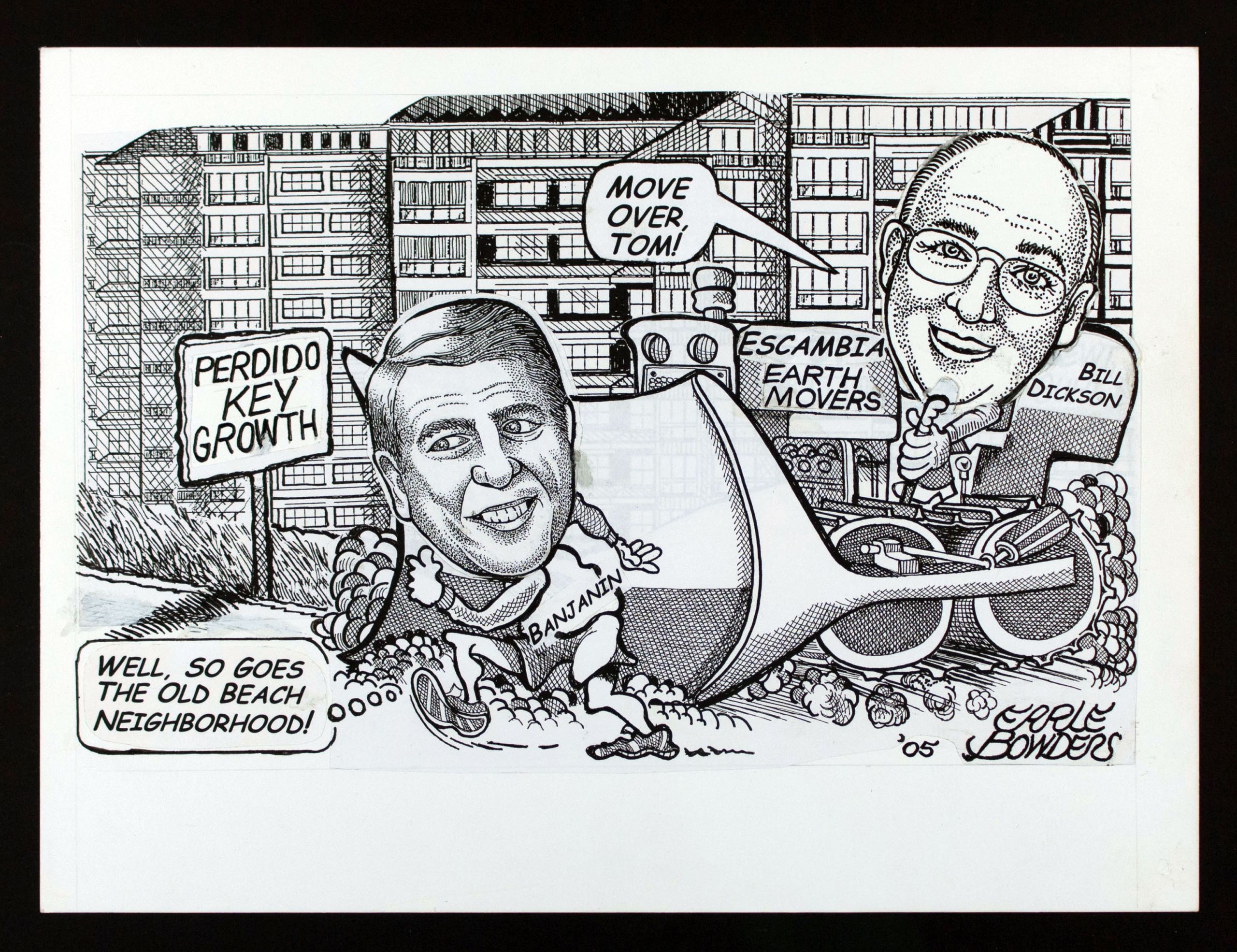 | Description/Context: | A stand-alone editorial cartoon expressing noting that County Commissioners Tom Banjanin and Bill Dickson are at odds over development of Perdido Key. |
