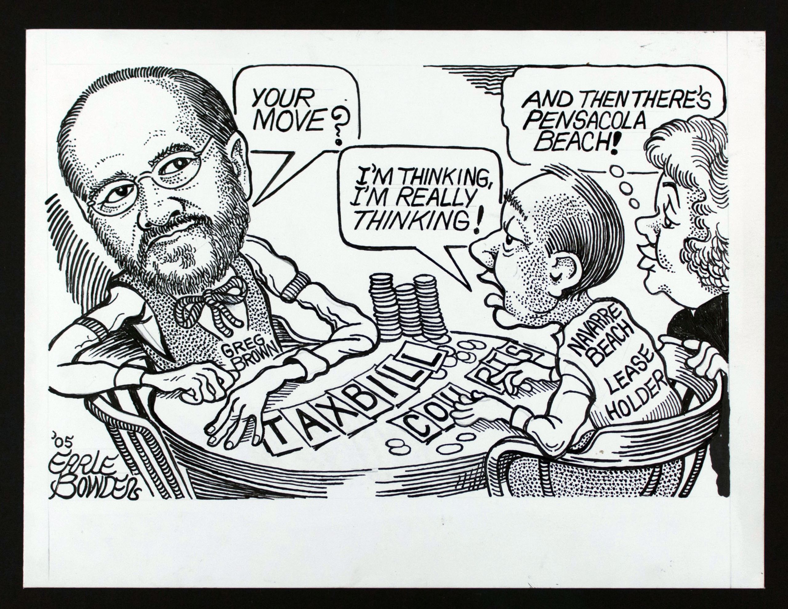 | Description/Context: | A stand-alone editorial cartoon noting the efforts of Santa Rosa County Property Appraiser Greg Brown to issue tax bills on Navarre Beach leaseholders, that this issue may also affect Pensacola Beach leaseholders as well. |