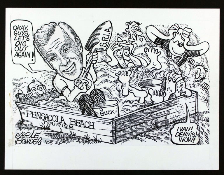 | Description/Context: | A stand-alone editorial cartoon noting that Buck Lee and the Santa Rosa Island Authority are again re-inventing Pensacola Beach tourism after national headlines of the damage of Hurricane Ivan in 2004 and Hurricane Dennis in 2005. |