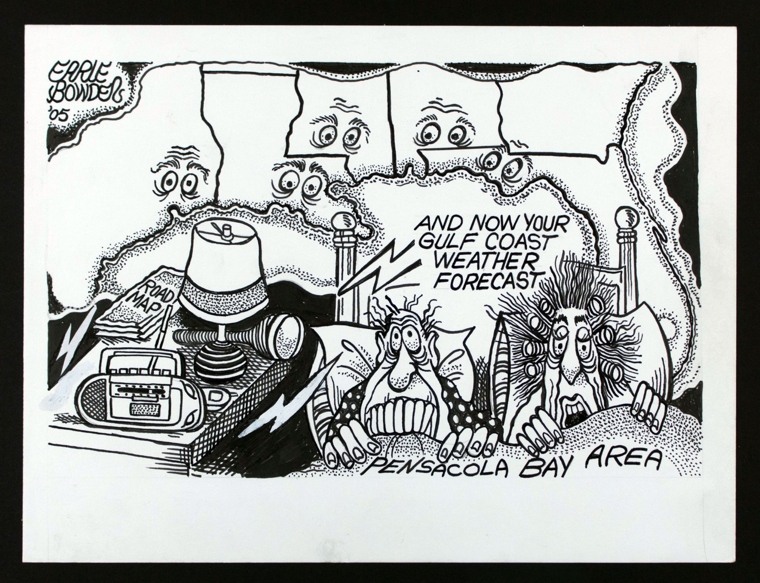 | Description/Context: | A stand-alone editorial cartoon noting the fear of listening to the Gulf Coast weather forecast, especially in the light of the anniversary of Hurricane Ivan in 2004, but also the recent near-miss of Hurricane Katrina in a busy, busy storm season. |