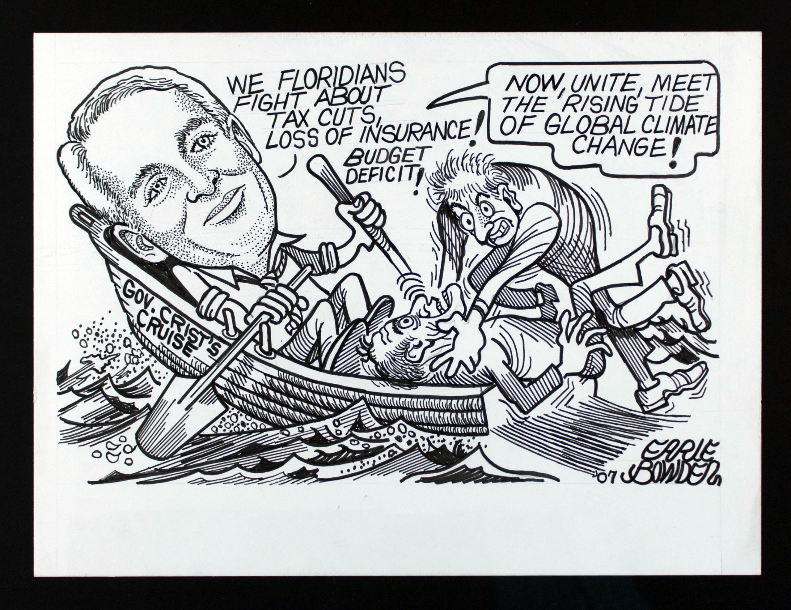 Description/Context: A stand-alone editorial cartoon noting Florida Governor Charlie Crist’s announcement of his intention to sign an executive order establishing limits on air pollution in Florida to fight global climate change, despite opposition of other Republicans.